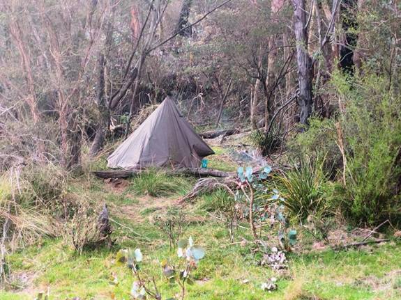 you see my tent (campfire out front) sheltered amongst the trees by the water's